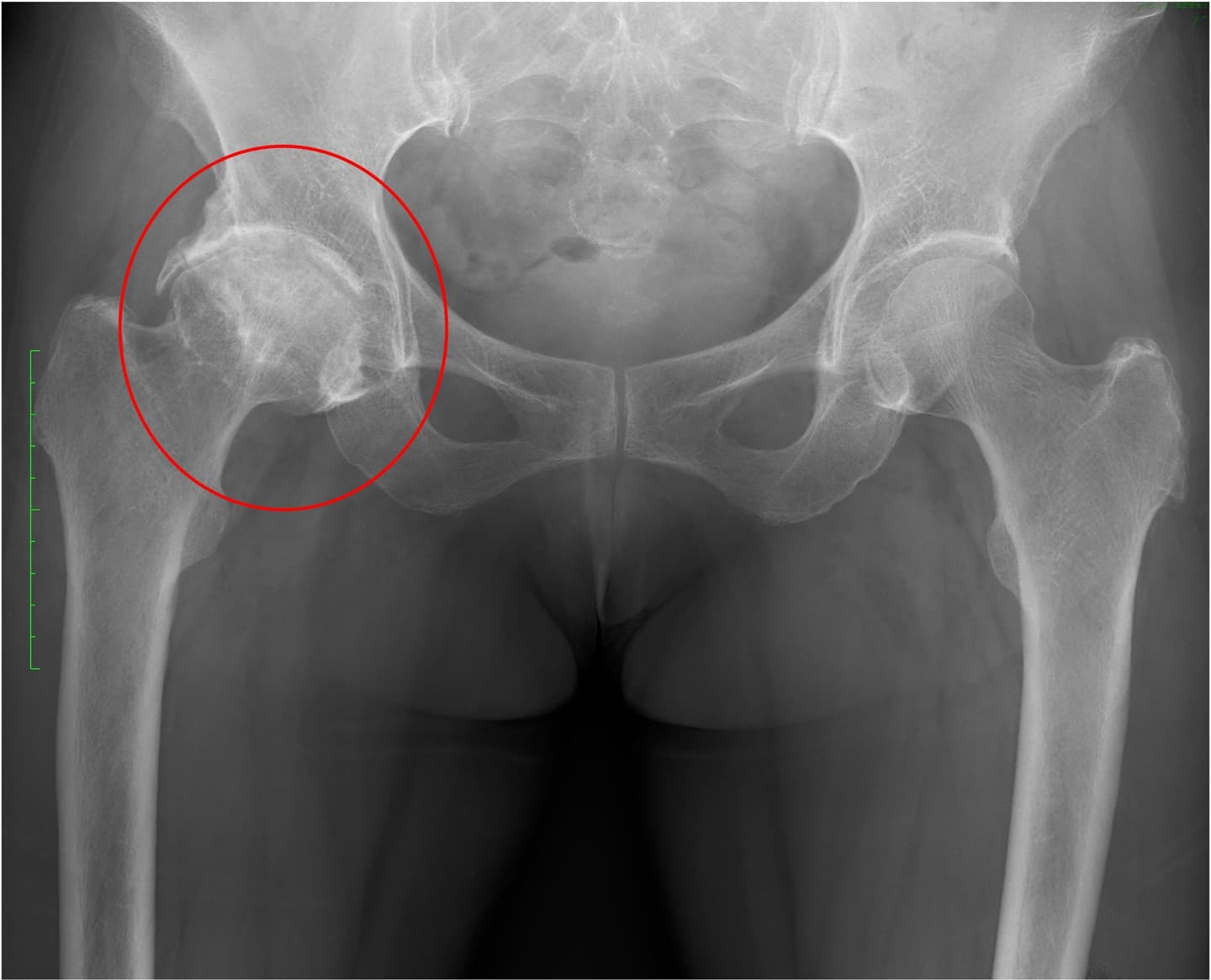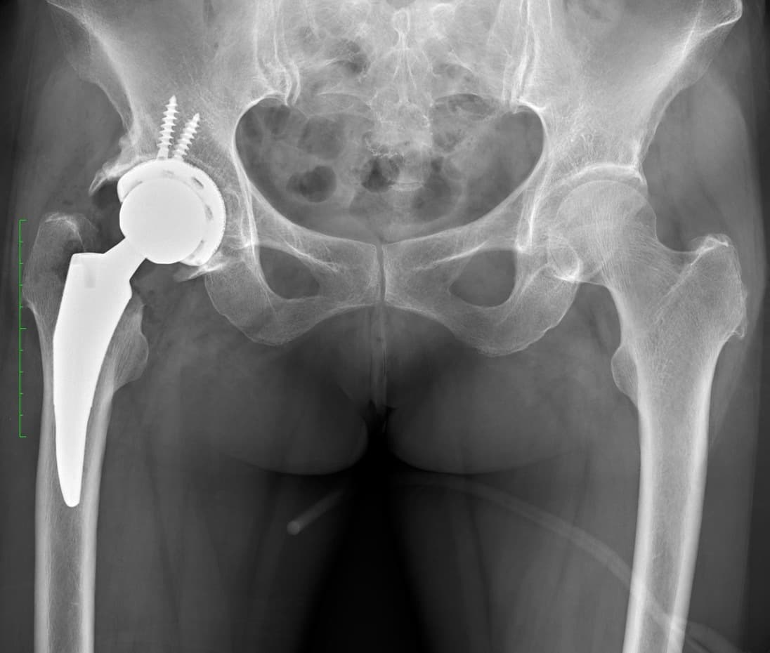 手術の1年半前より右股関節痛が出現し、徐々に歩行時痛は増強し夜間も右股関節〜大腿部へ疼くような疼痛も出現、術前は疼痛による右下肢への荷重困難と股関節の可動域制限、筋力低下により屋内では壁伝いで7m程度、屋外では足を引きずる形で10分程度の歩行耐久性でした(動画)。また足が開きにくいことで靴下の着脱や足の爪切り動作の困難感がみられました。近医での治療行うも症状改善なく当院へ2023年3月受診され、右変形性股関節症の診断あり同年5月に右人工股関節置換術が行われました。