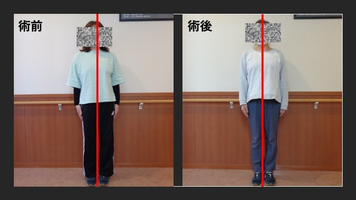 また、入院中の理学療法は下肢の柔軟性向上・体幹の固定性、安定性向上を目標に下肢のストレッチング、体幹トレーニング、パンフレットを使用して腰椎に負担の少ない姿勢・動作の指導などを中心に行っていました。その結果、術後2週(退院時)には姿勢の改善もみられています。