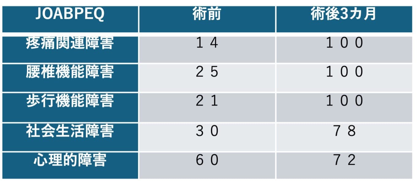術後1日目には左下肢の痛み痺れは消失し、歩行器での歩行が可能となっています。